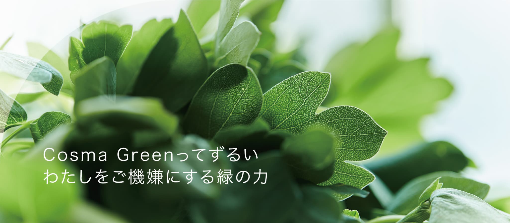 Cosma Green(コスマグリーン)は、「誰もがスマートに緑の力を」というコンセプトのもとつくられたヘルシーフード スペシャリティブランド。その名称の由来は、Co(みんなに・共通の)・Smart(スマートに・賢く)・Green(緑の力)を組み合わせた造語であり、わたしたちのコンセプトを表現しています。年齢・性別・生活様式……に関わらず、「誰もがスマートに緑の力を」日常へ取り入れ、活力漲る緑のような美しい日々を過ごしてほしいと願っています。日常はCosma Greenと共に……